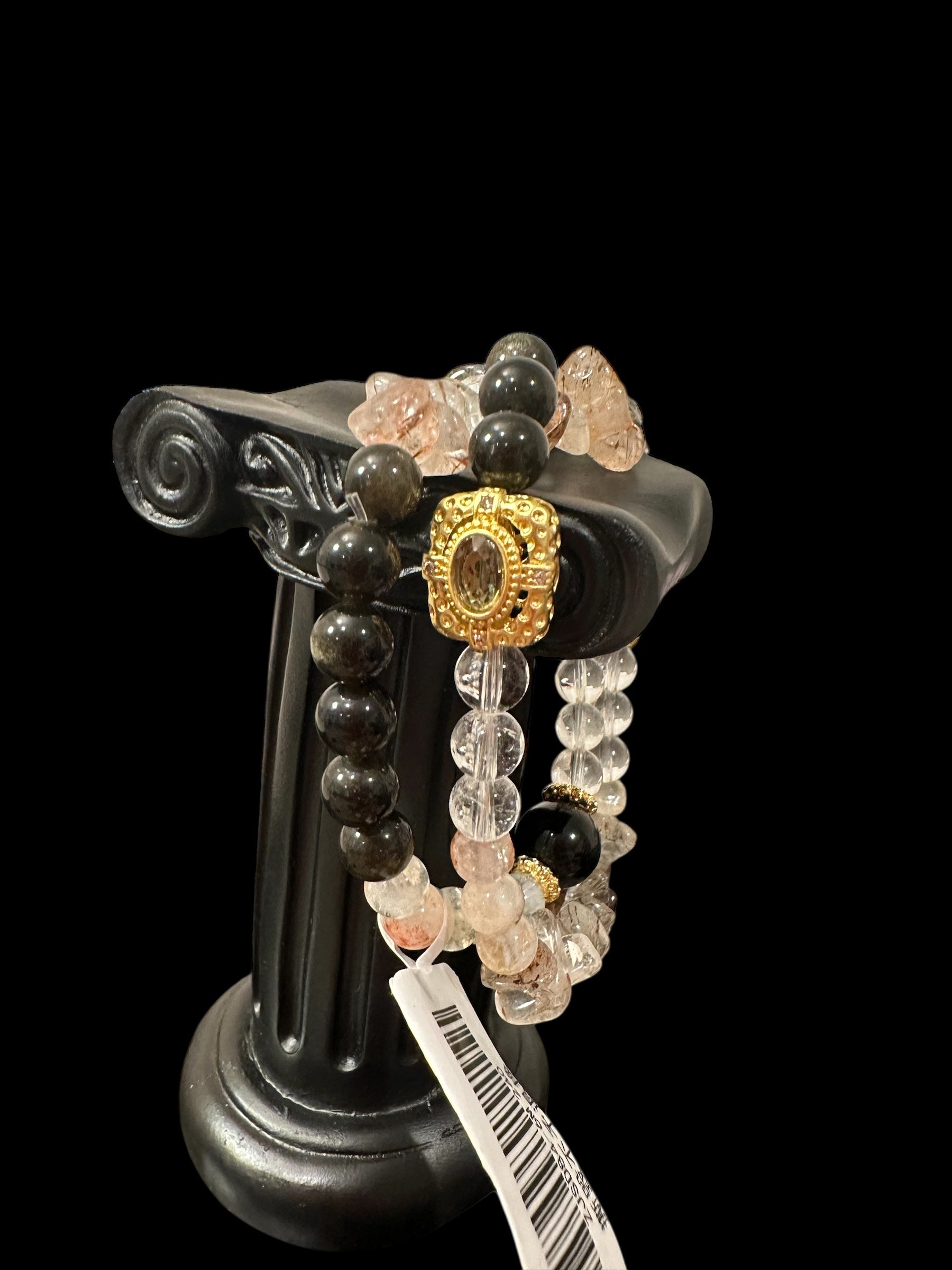 Elevate your style with our Natural Obsidian, Rock Quartz & Rutilated Quartz 2-Layer Bracelet — a harmonious blend of grounding and illuminating gemstones: