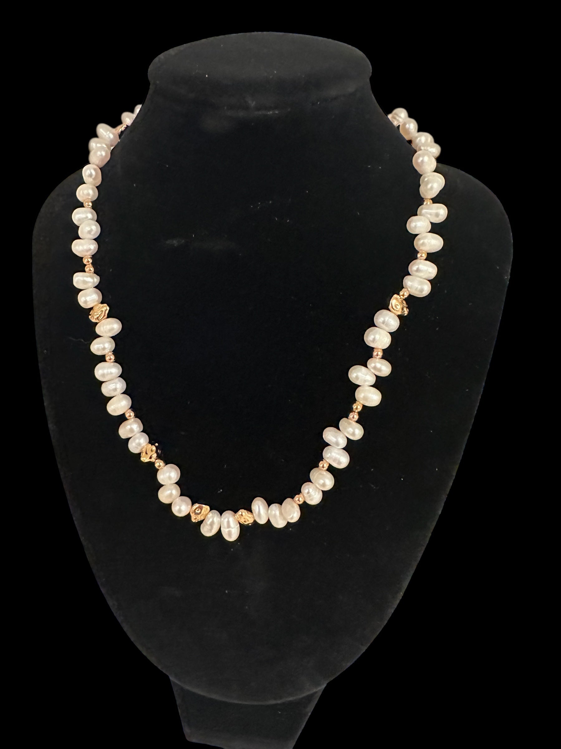 This necklace features a thoughtfully unstructured arrangement of natural freshwater pearls, each uniquely shaped and softly luminous. Interspersed with sculptural 18K gold-plated S925 silver accents, the piece flows like scattered light along the neckline, offering both movement and harmony.